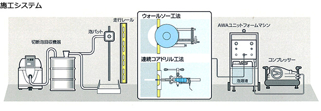 AWAT工法の特徴は、水の代わりに泡溶液を用い、AWAユニットを使用し切断泡を形成。ウォールソー及びコアドリルにより切断・穿孔して壁に部分スリットを形成する点です。